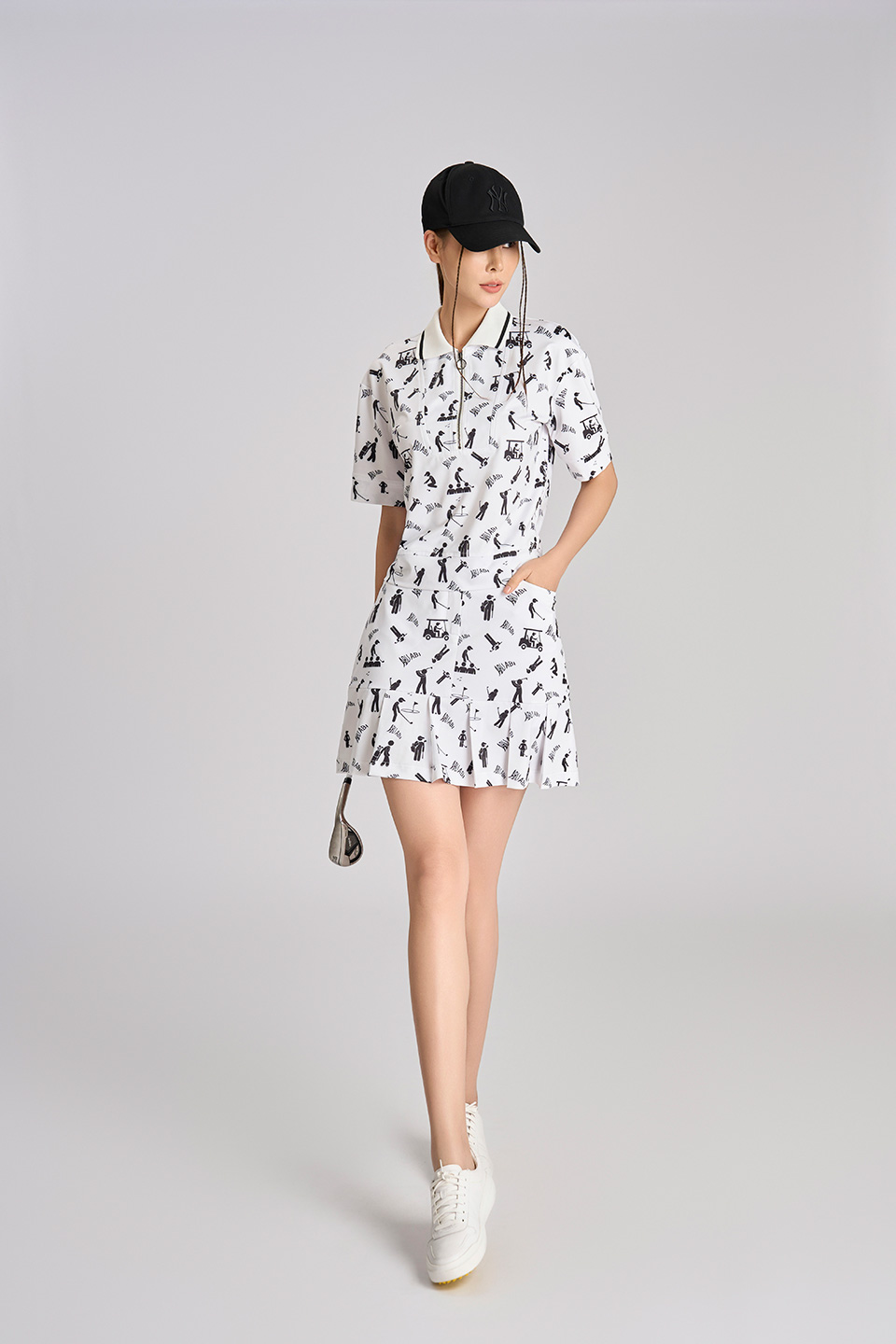 Váy golf với họa tiết thiết kế độc quyền của AbuAbi Golf, lấy cảm hứng từ các thế đánh golf, cùng phần gấu váy xếp ly tôn dáng. Quần biker bên trong mang lại sự thoải mái và kín đáo, tự tin khi di chuyển. Hai túi trước và hai túi sau, khóa kéo phía trước kết hợp nút cài. Có móc treo túi bóng golf mini phía sau.
